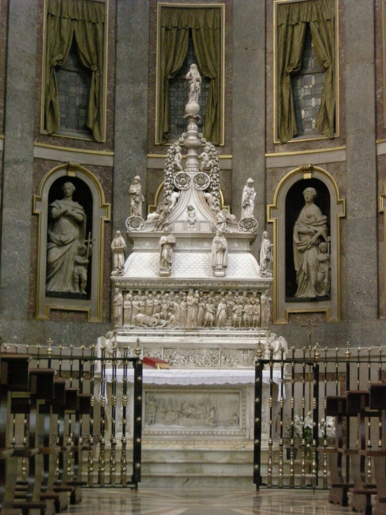 Santo Domingo murió aquí en 1221 y fue enterrado detrás del altar. En 1234 sería canonizado, y a partir de entonces los fieles regalaron magníficas obras de arte, muchas de las cuales aún se conservan. De todas la más importante es el arca de mármol que se hizo para conservar en ella el cuerpo del santo, hecha entre otros por Nicolò dell’Arca (conocido por ese nombre precisamente por eso), al que ya conocemos, o por un joven Miguel Ángel que dejó aquí algunas esculturas.
