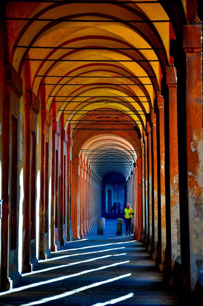 Luego recorreremos antiguas y pintorescas callejuelas para terminar ante la magnificencia de las dos torres que representan la ciudad: Garisenda y Asinelli. Entre los siglos XII y XIII se elevaban en Bolonia más de cien torres, símbolo en aquellos tiempos del poder económico de las familias que las mandaban construir para competir con sus rivales y a la vez fortificar sus residencias. Hoy “sólo” quedan 22. Dos de ellas, la Torre Garisenda (48 m de altura) y la Torre de los Asinelli (97 m), ambas del siglo XV, son conocidas como las Torri Pendenti, inclinadas, dos esbeltas atalayas que se atisban desde muchos rincones de Bolonia. Se llega hasta ellas caminando por el pasillo cubierto más largo del mundo (3,5 km), con 666 arcos.