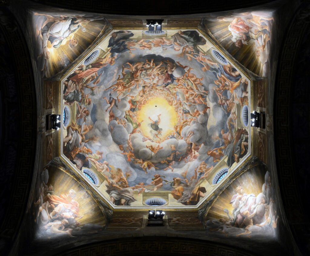 …y las pinturas hechas en el Renacimiento por uno de los más grandes pintores de la época, Correggio, que dejó obras extraordinarias en la ciudad, empezando por la cúpula de la catedral dedicada a la Asunción de la Virgen, rodeada de apóstoles, ángeles y los santos patrones de la ciudad, una de las obras maestras del arte italiano de todos los tiempos.