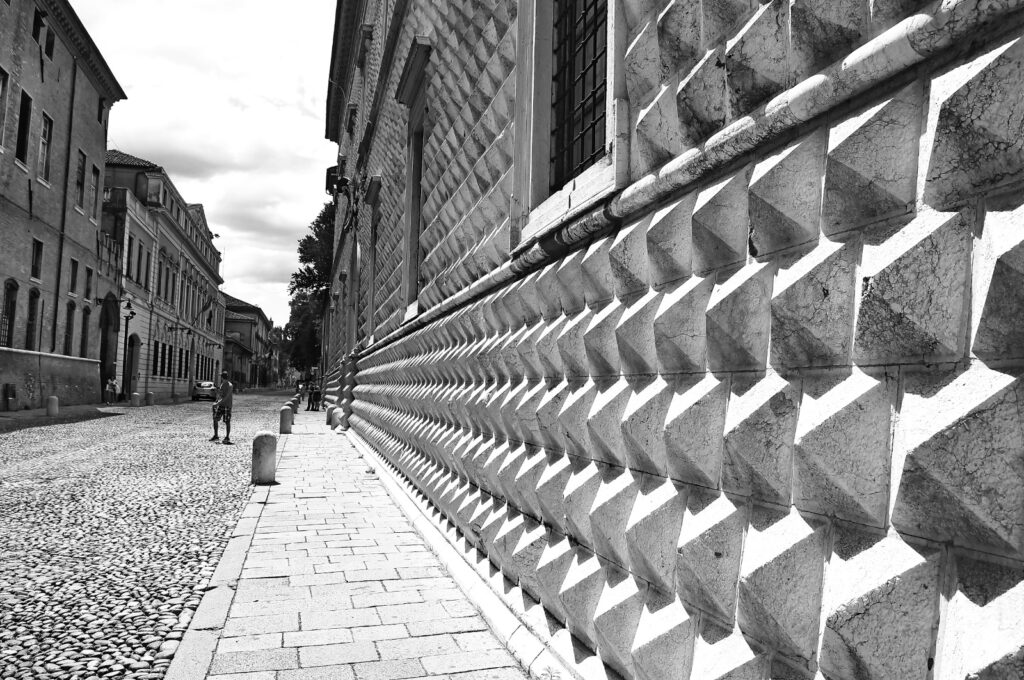 Los arquitectos del Renacimiento crearon aquí la primera ciudad moderna, con calles rectilíneas y amplias perspectivas muy distintas de lo que resultaba habitual, callejones tortuosos, pasadizos y recovecos oscuros. Ferrara llenó sus calles de palacios e iglesias del Renacimiento y adquirió una fisonomía completamente nueva.