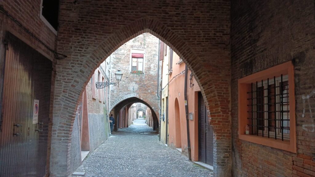 Comeremos (incluido) y continuaremos nuestro paseo panorámico de la ciudad en el que veremos las estrellas callejuelas del barrio judío, el ghetto… En época de los Este llegaron aquí muchos judíos de todas partes de Europa, pero aquella libertad y riqueza acabaron cuando Ferrara pasó a ser parte del Estado Pontificio. A partir de 1627, el Papa ordenó la creación del gueto en el que segregó a los judíos hasta 1859, con la que probablemente sea la calle más bonita de la ciudad: la via delle Volte, una calle larga y estrecha que era una de las principales arterias comerciales de la ciudad medieval llena de “volte”, pasadizos sobreelevados que conectan los edificios de ambos lados y acaban en forma de arco abovedado.
