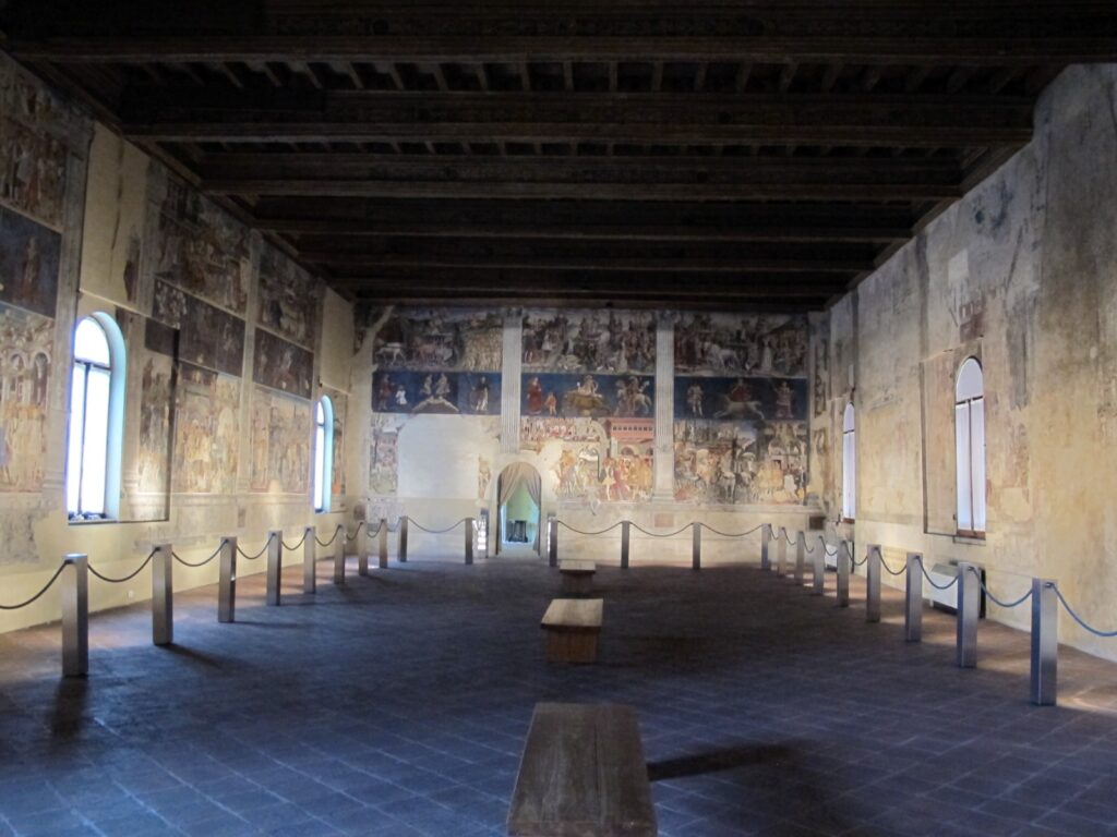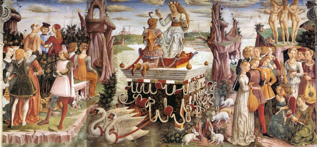 En la época dorada de Ferrara, bajo el ducado de los Este, surgieron muchos palacetes en la ciudad y en los alrededores: las llamadas Delizie Estensi, “delicias de los Este”. La más famosa de todas es el Palazzo Schifanoia, en el que no podemos perdernos la enorme Sala de los Meses, completamente cubierta con uno de los más famosos ciclos profanos de frescos renacentistas.