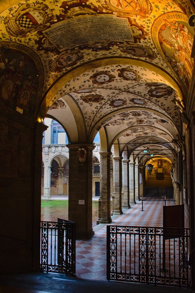 La última mañana del viaje la pasaremos en BOLONIA nuevamente, visitando un lugar muy especial: el Arquigimnasio, sede de la Universidad entre el siglo XVI y principios del XIX. Como testimonio de esa larga historia ha quedado un enorme conjunto de siete mil escudos de armas de los estudiantes, con inscripciones en su honor, que afortunadamente se salvaron de la destrucción ordenada por el gobierno republicano en 1797 y de los bombardeos durante la Segunda Guerra Mundial.