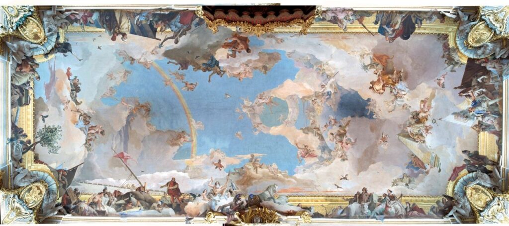 En estos salones, escaleras… se libró un duelo entre los dos pintores más importantes de mediados del siglo XVIII, con dos maneras completamente distintas y a la vez rabiosamente modernas de entender la pintura: el veneciano Giambattista Tiepolo, el último representante de la gran tradición barroca, y el checo Anton Raphael Mengs, el mejor representante del clasicismo.